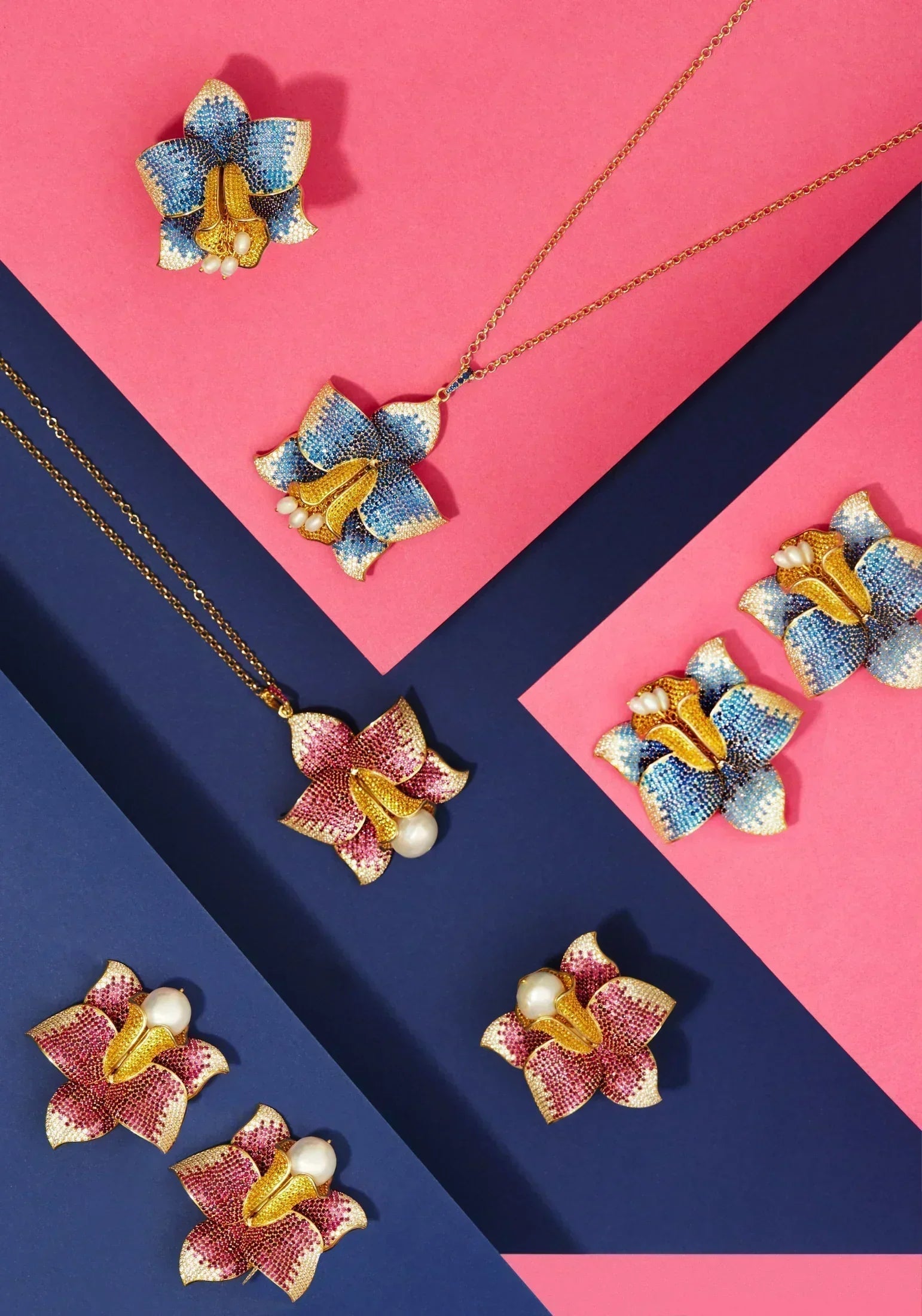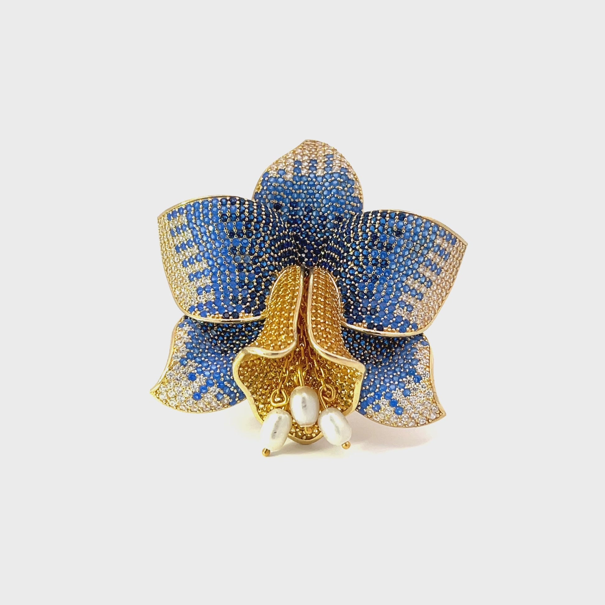 Meticulously handcrafted with 925 sterling silver that has been dipped in gold. This stunning cocktail ring is designed with exquisite detail, featuring sapphire blue, yellow, and white zirconia, topped off with three small pearls set inside the trumpet of this majestic flower to add a hint of elegance and class.