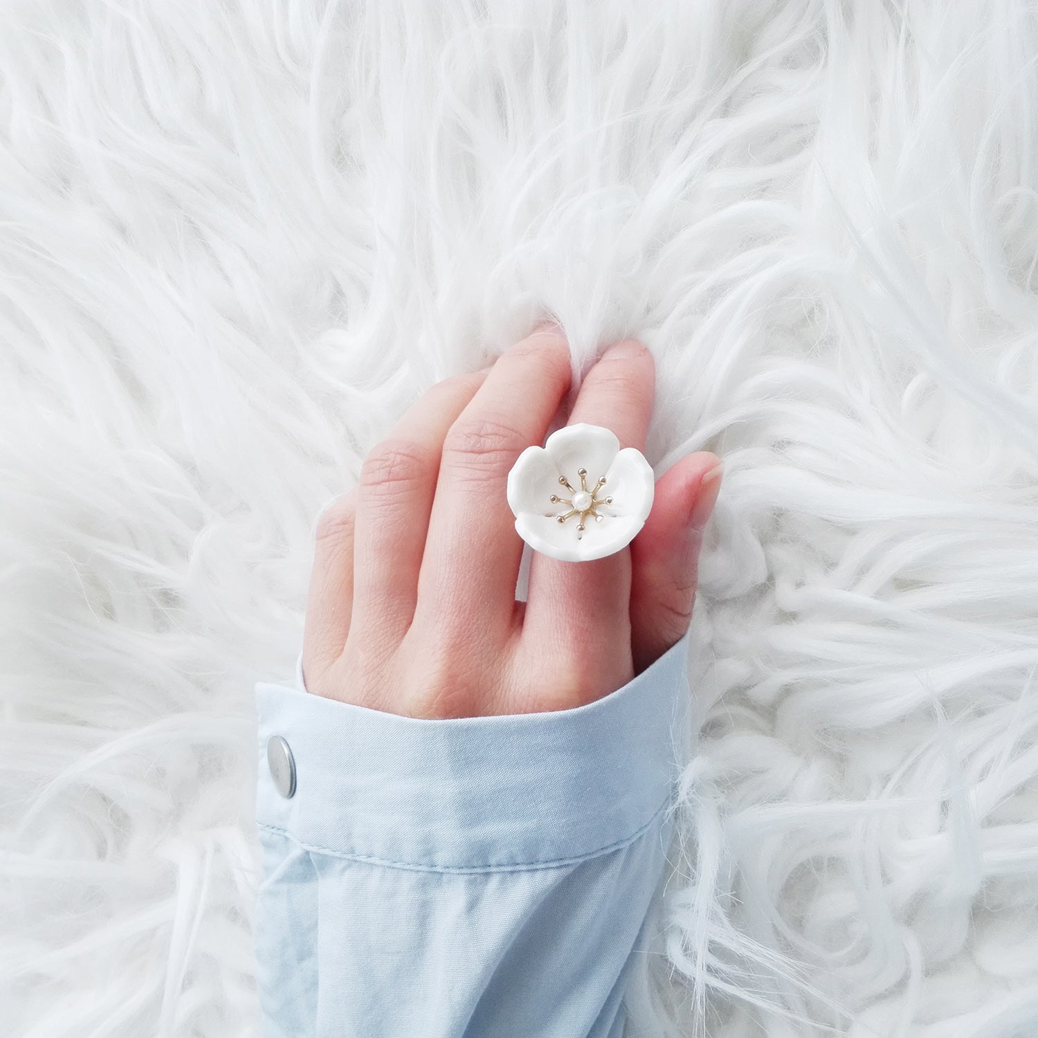 The beautiful plum blossom, who never fears frost and snow, bravely flowers in the coldest seasons, awakening spring and bringing hope. The pure and delicate petals deserve your extra love and care. Ring is made of porcelain flower; gold-plated silver ring and a small freshwater pearl.
